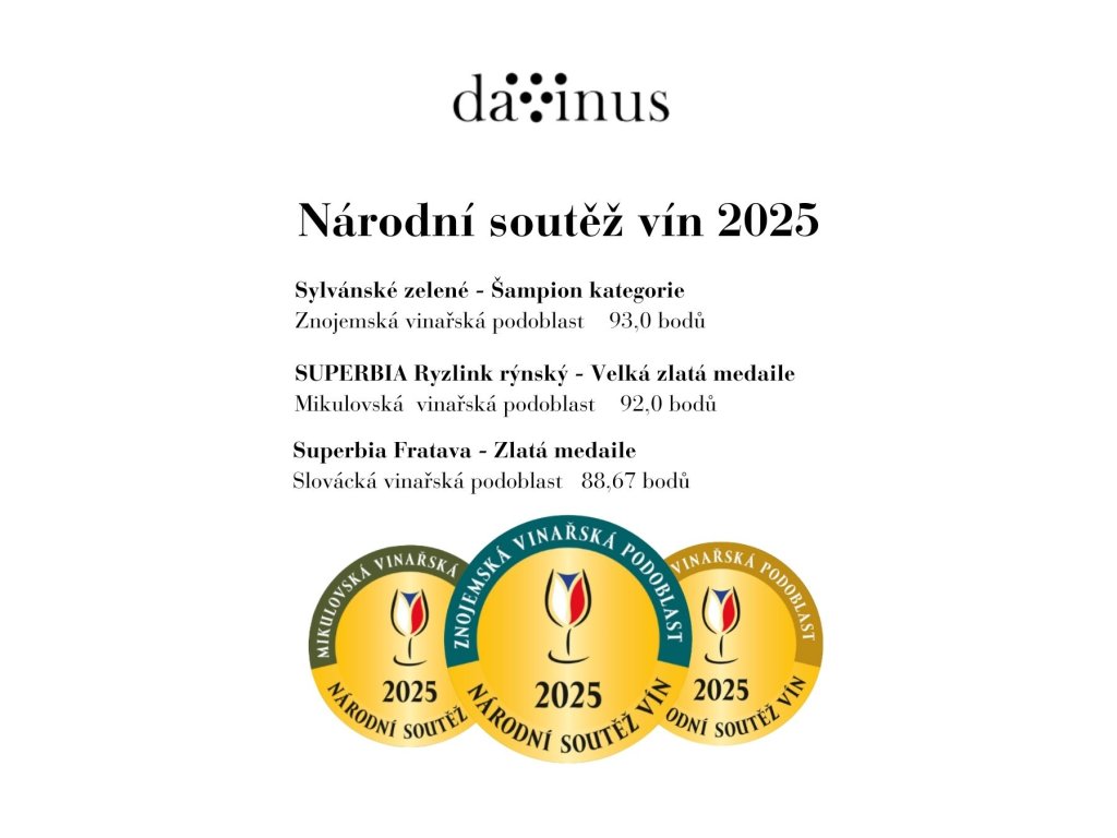 Ocenění - Šampion Sylvánské zelené, Velká zlatá medaile SUPERBIA Ryzlink rýnský, Zlatá medaile Fratava - Národní soutěž vín 2025
